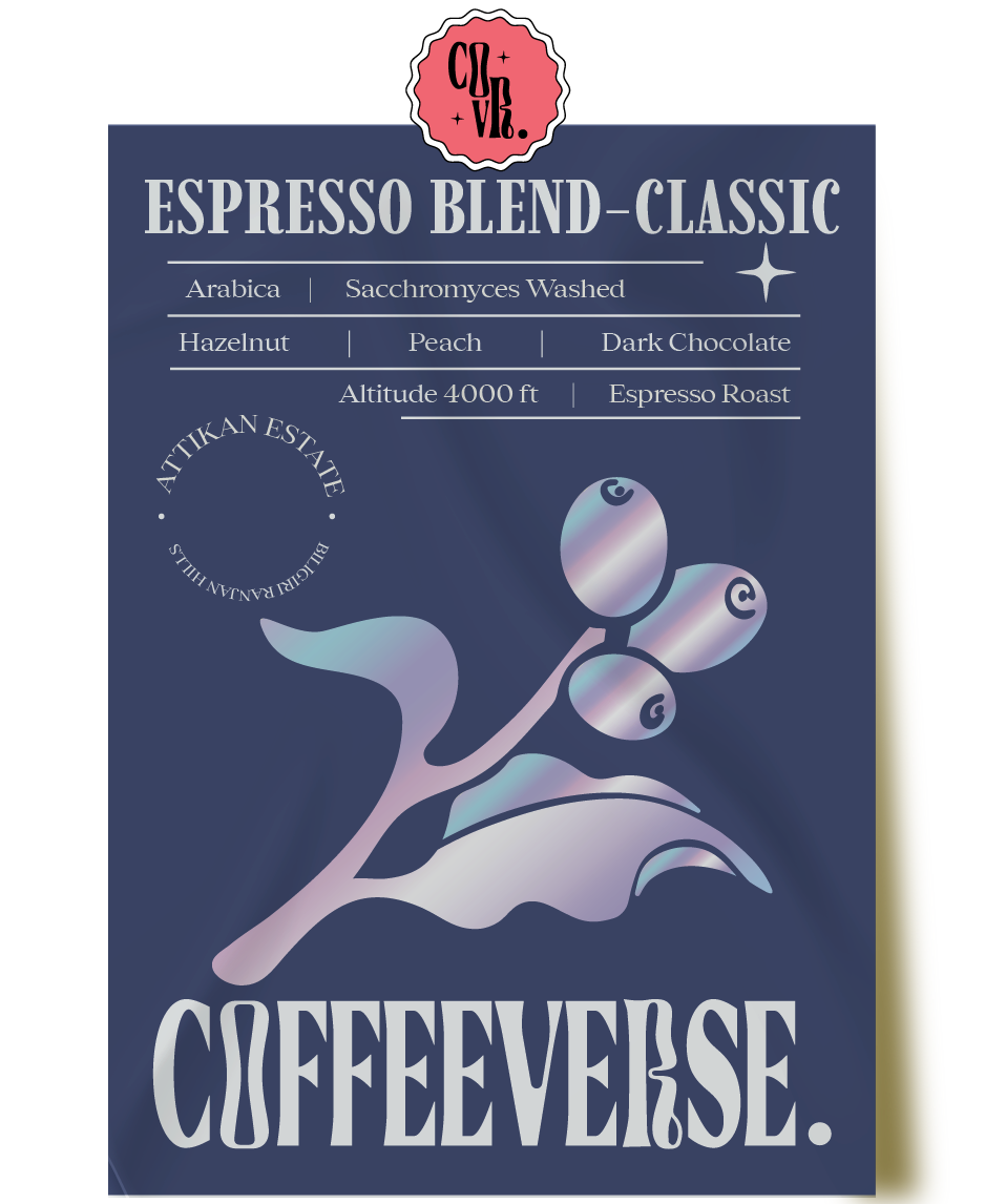 Bold, structured, and full-bodied—COFFEEVERSE’s Espresso Blend Classic is a masterfully crafted roast from the renowned Attikan Estate, designed for those who seek a classic espresso with elevated nuances. This 100% Arabica blend undergoes a sophisticated Saccharomyces cerevisiae fermentation, a process that enhances intercellular breakdown within the coffee cherry through a CO₂-rich environment. This cutting-edge technique unlocks a cup layered with clarity, complexity, and balance.