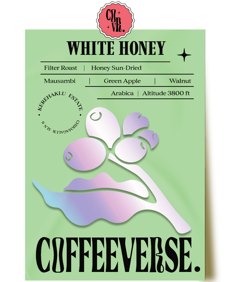 Elegant, nuanced, and beautifully mellow, the COFFEEVERSE White Honey Filter Roast is a 100% specialty Arabica offering from Kerehaklu Estate, known for its commitment to regenerative farming in the Western Ghats. This coffee is processed using the white honey method—a semi-washed technique in which much of the mucilage is removed prior to drying, resulting in a clean, balanced cup that retains gentle fruit notes and a smooth texture.