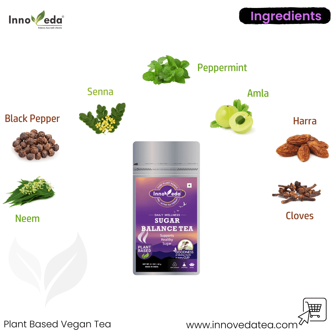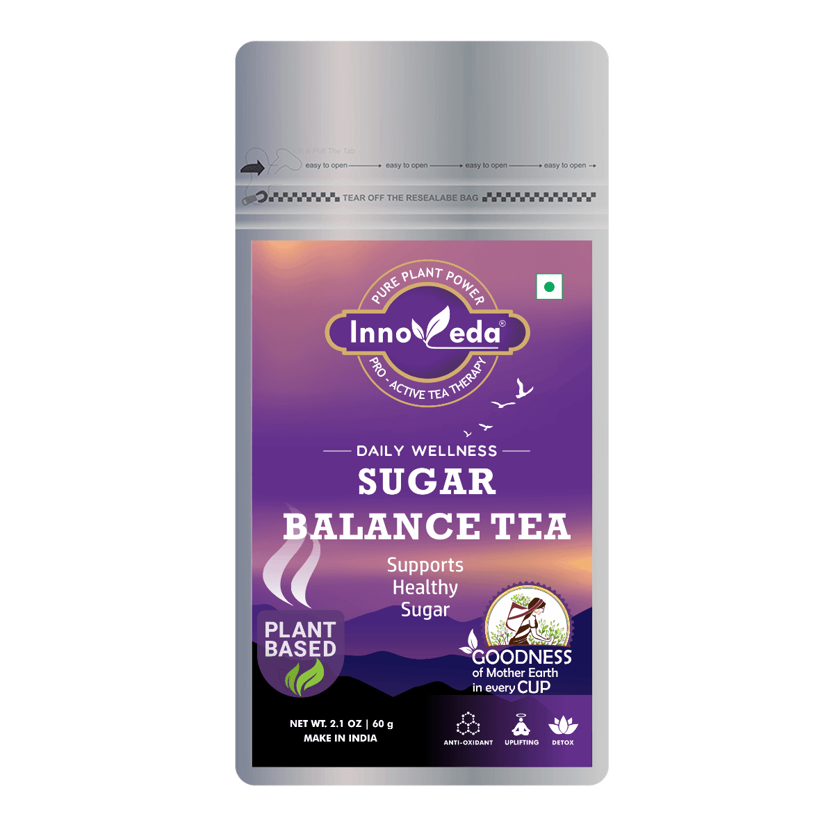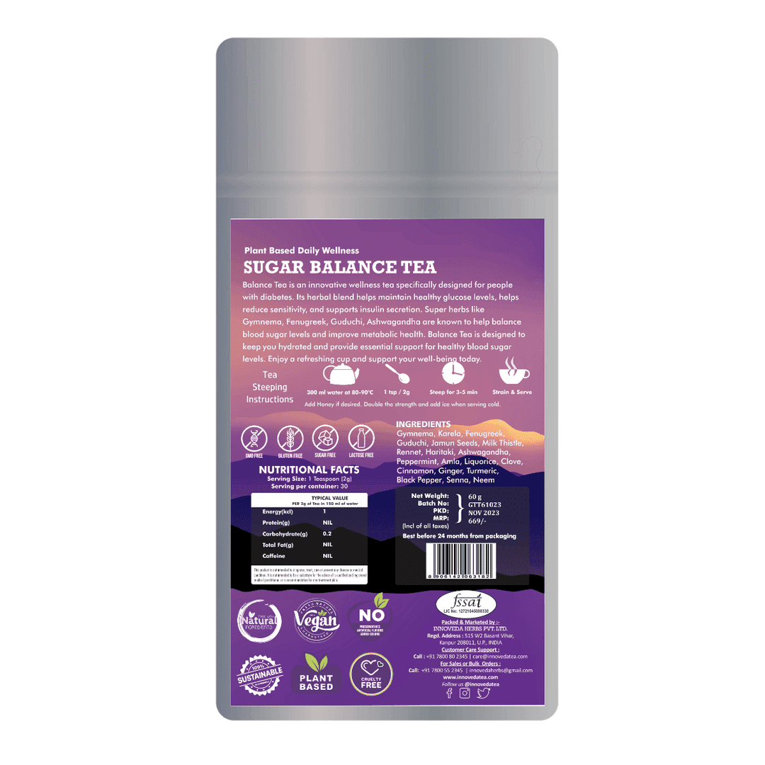 Balance Tea is an expert blend of superfoods designed for diabetes management. It contains ingredients such as Gymnema, Fenugreek, Guduchi, Ashwagandha, and others, all of which are known to help balance blood sugar levels and improve metabolic health.