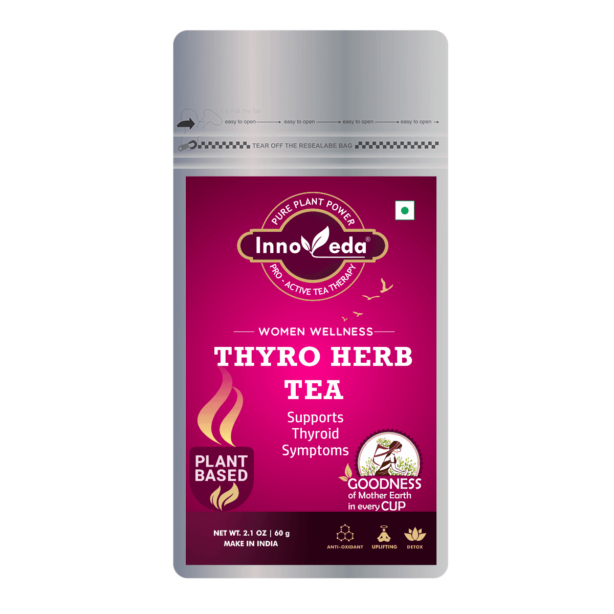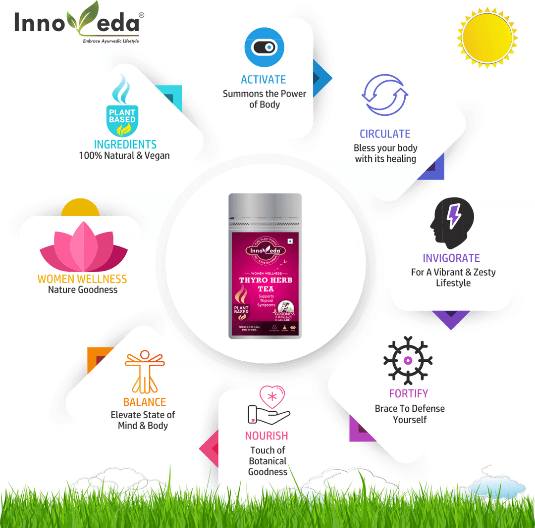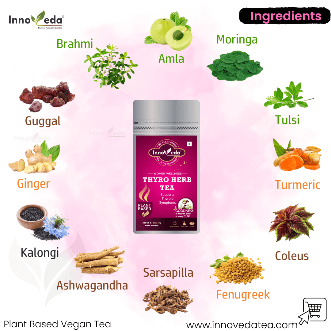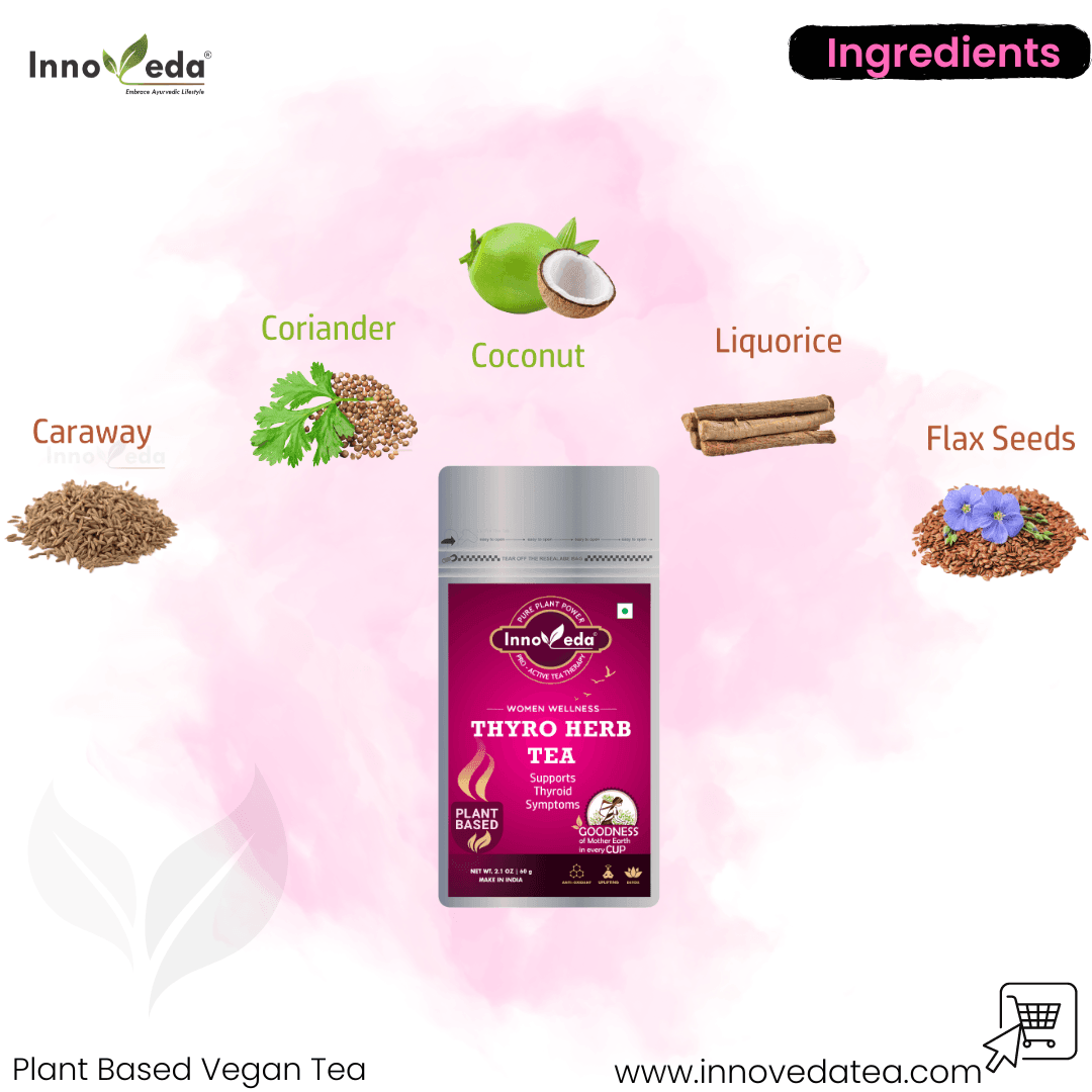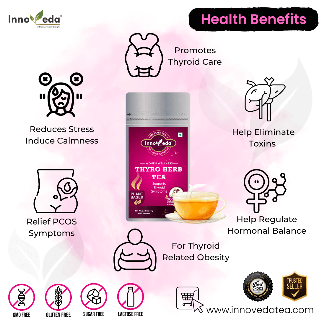 Thyro Herb Tea supports thyroid health, reduces anxiety, balances hormones, and aids PCOS and obesity using a nutrient-rich herbal blend.