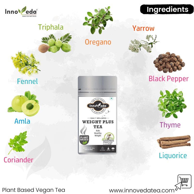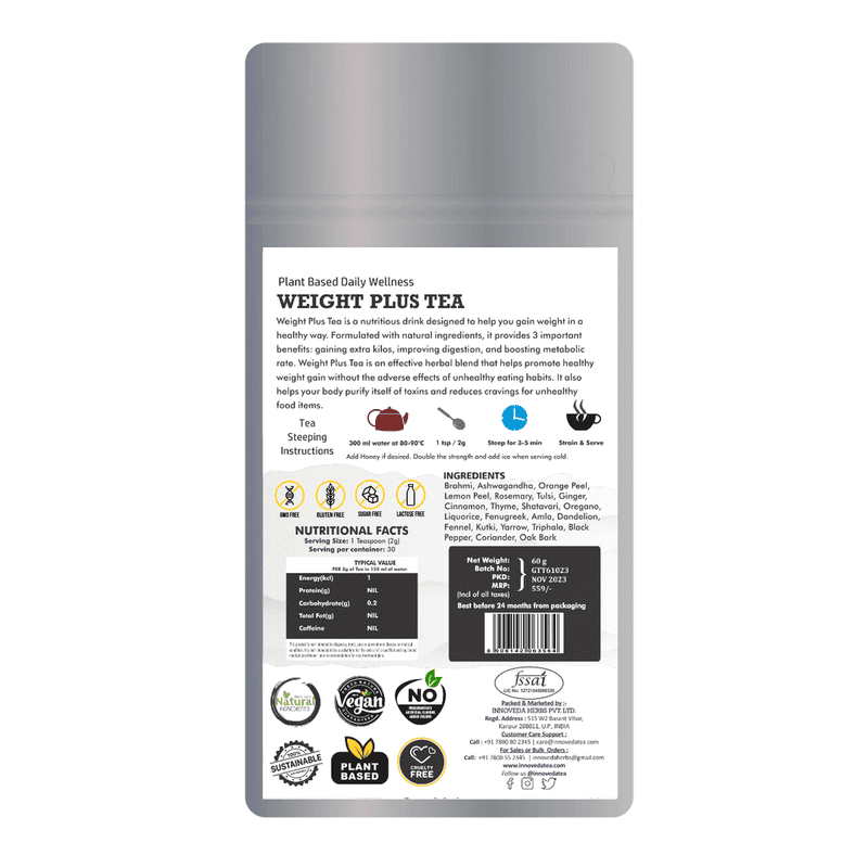 Weight Plus Tea is a powerful botanical blend crafted to support healthy weight gain. Featuring ingredients like Brahmi, Ashwagandha, Amla, Lemon Peel, Tulsi, Cinnamon, and Thyme, it detoxifies the liver, reduces cravings, improves digestion, and boosts metabolism. This earthy, citrusy, slightly tart tea helps add inches to key areas while supporting a radiant, nourished look.