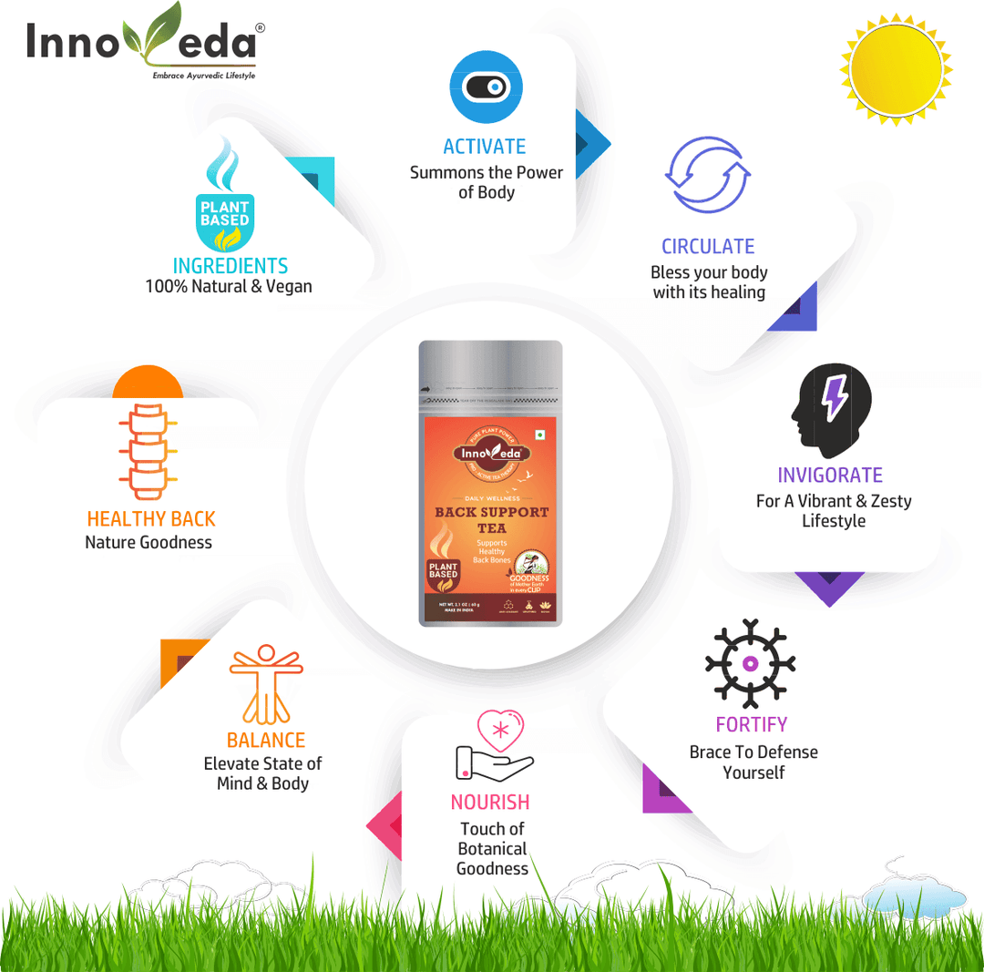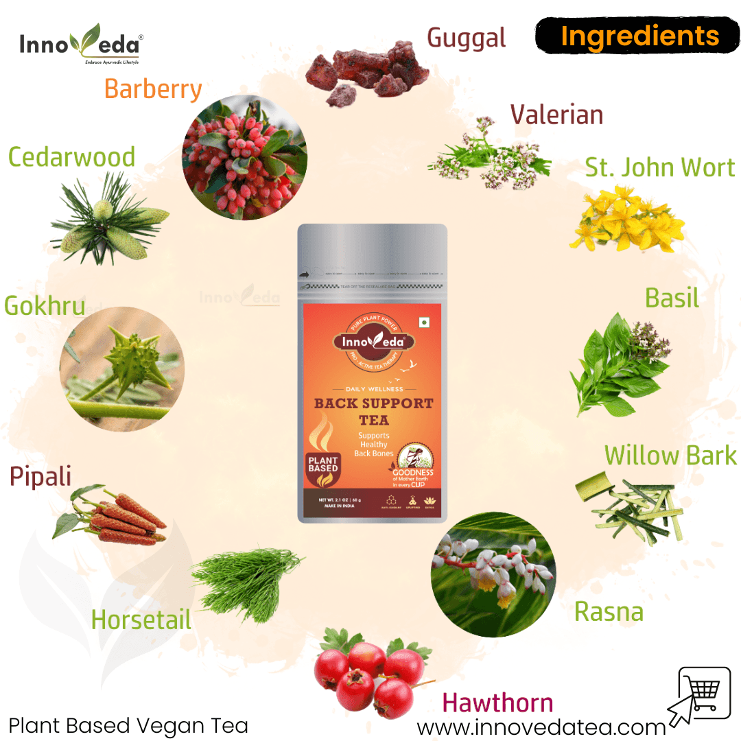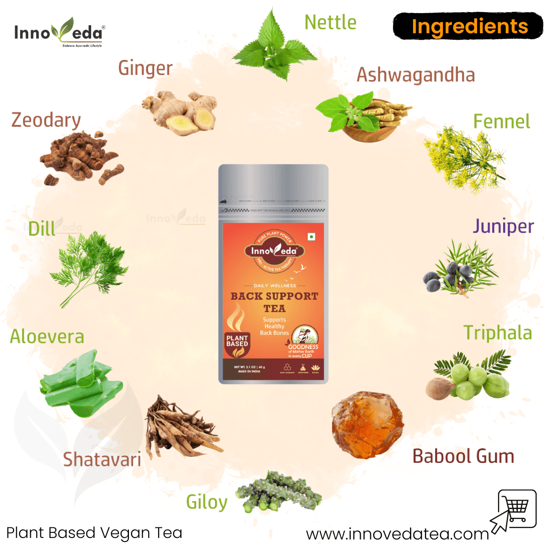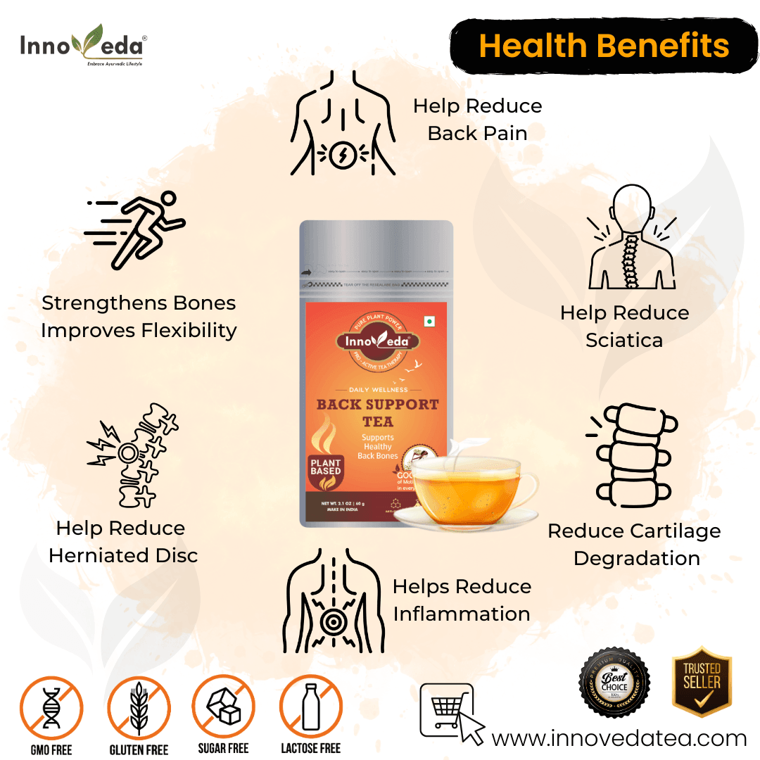 Back Support Tea relieves back pain, improves flexibility, and reduces inflammation with a powerful blend of herbs like Gokhru and Ashwagandha.