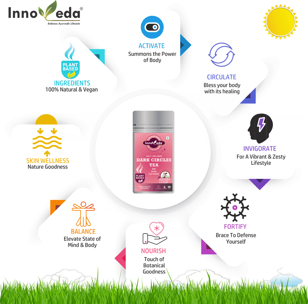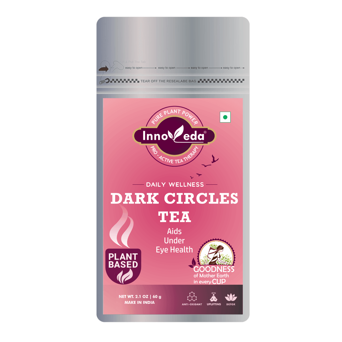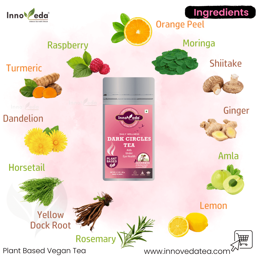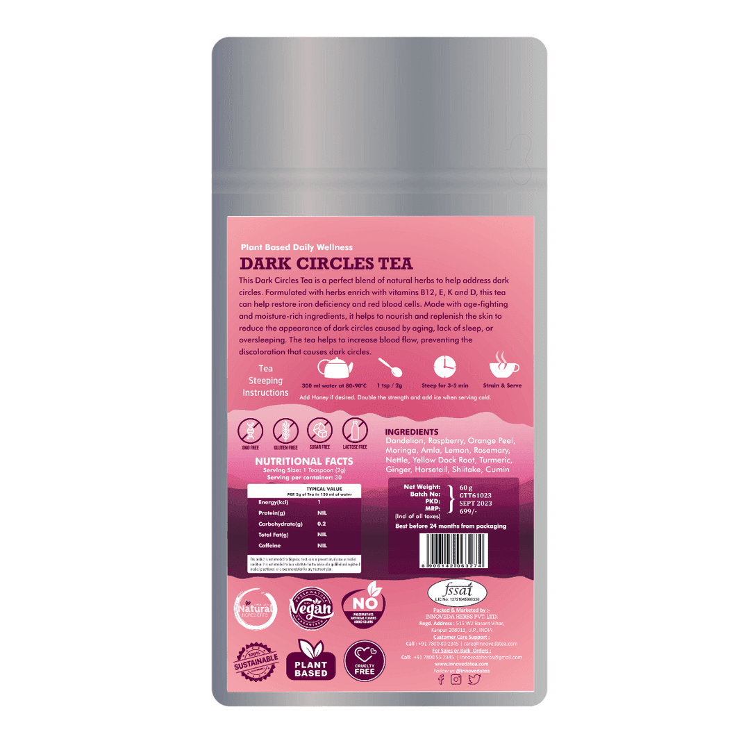 Innoveda Dark Circles Tea is an effective blend of naturally sourced herbs to help purify and hydrate skin while removing discoloration. Its unique blend of Raspberry, Orange Peel, Moringa, Amla, Lemon, Rosemary, Nettle, Yellow Dock, Turmeric, Ginger, Horsetail, Shiitake, Cumin, and Dandelion make it effective for all ages and skin types.