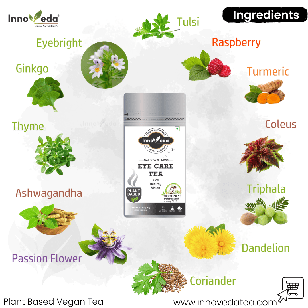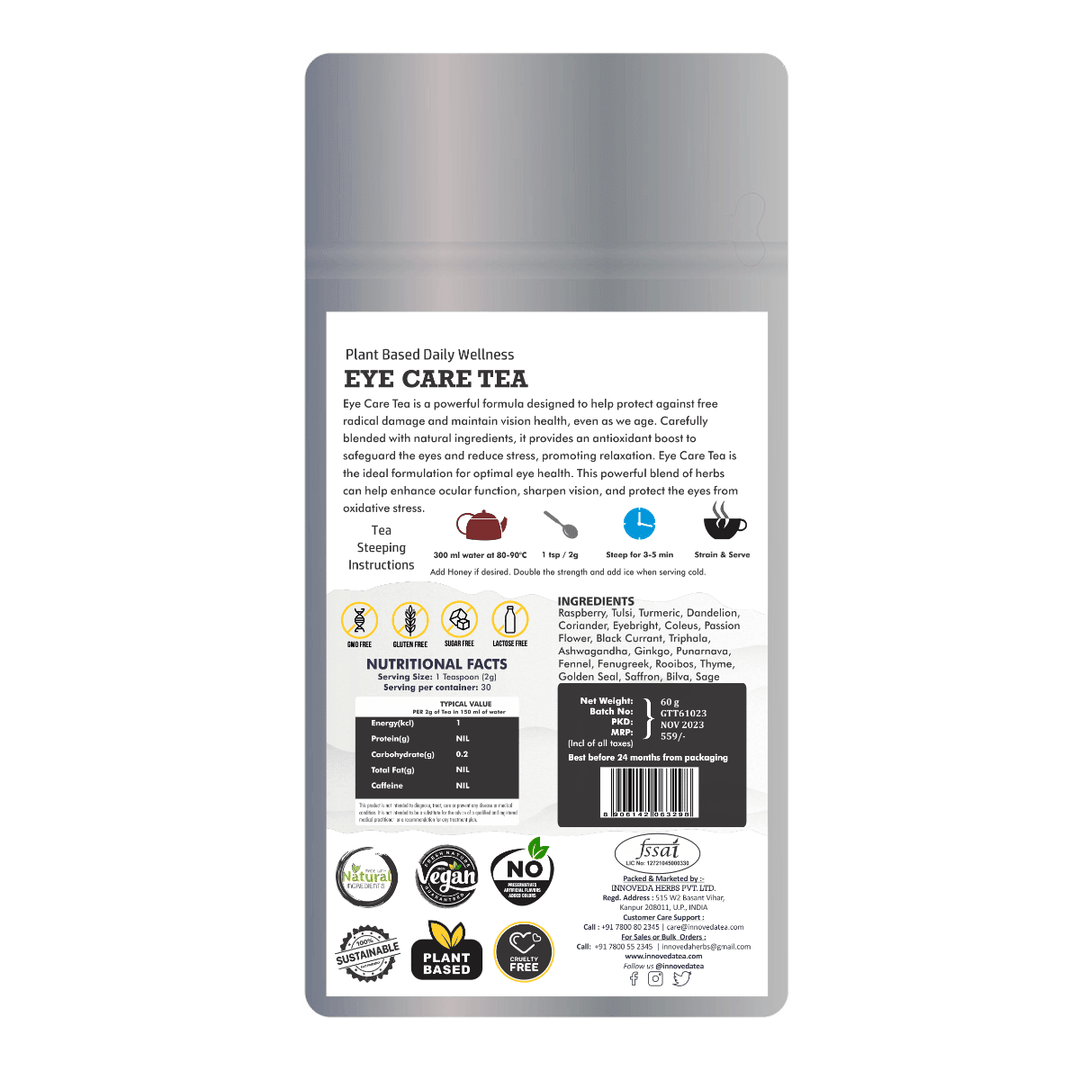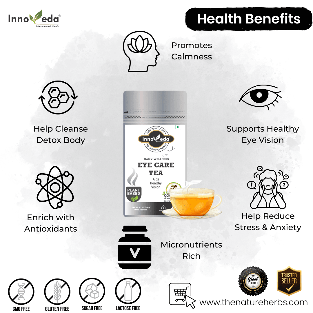 Experience better vision with Innoveda Eye Care Tea. Each cup delivers essential nutrients for eye health, including vitamins A, C, E, lutein, and zeaxanthin.