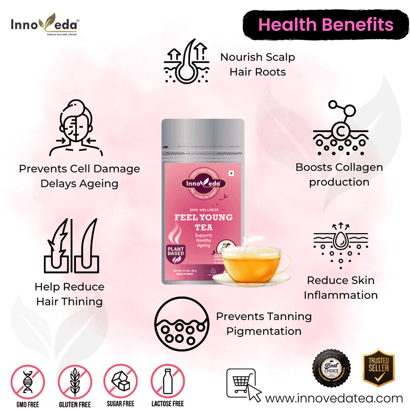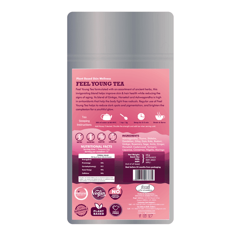 Feel Young Tea brightens skin, reduces pigmentation, fights aging, controls acne, and nourishes hair with antioxidant-rich botanicals and antibacterial herbs.