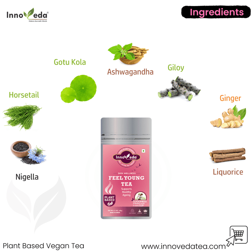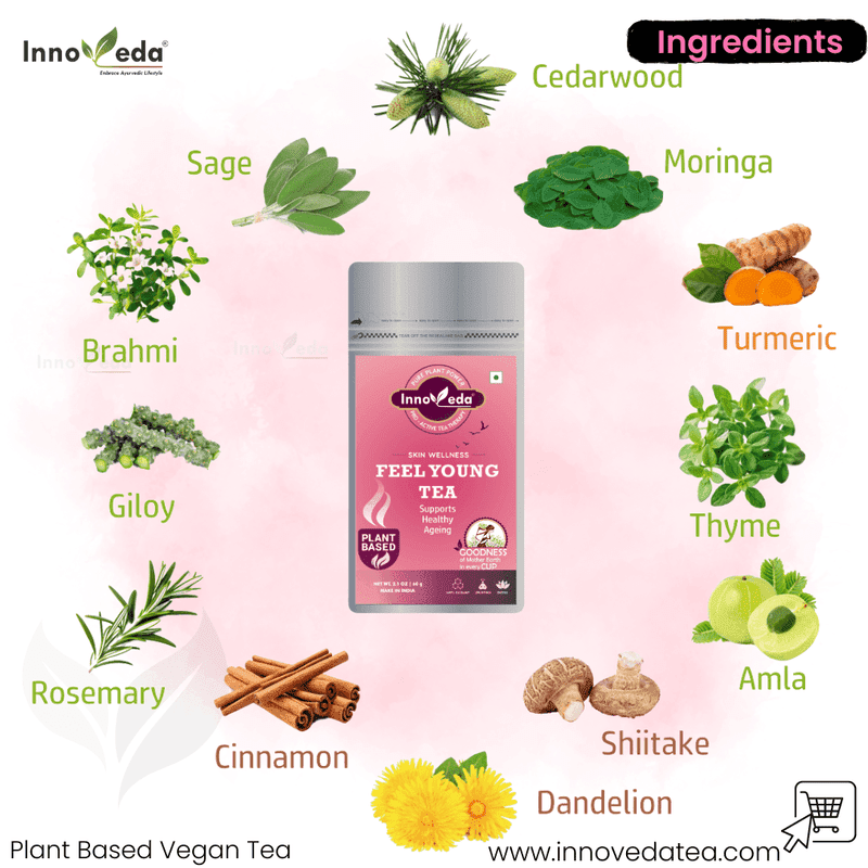 | Ingredients (Tea) | Amla, Ashwagandha, Brahmi, Cedarwood, Cinnamon, Dandelion Root, Giloy, Ginger, Ginkgo Biloba, Gotu Kola, Horsetail, Liquorice, Moringa, Nigella, Rosemary, Sage, Shiitake, Thyme, Turmeric |