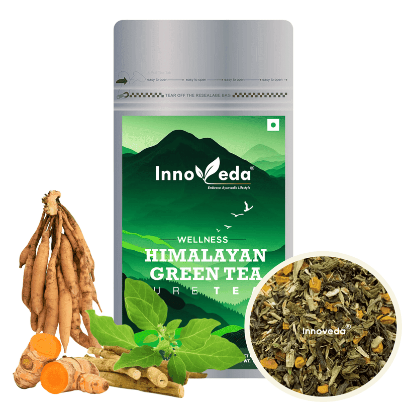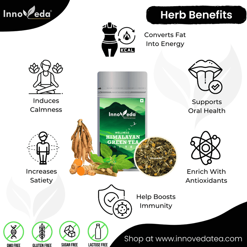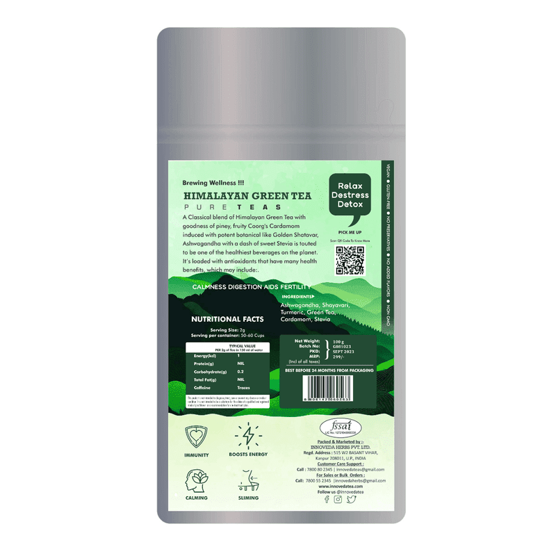Himalayan Green Tea boosts immunity, burns fat, reduces stress, and enhances brain health with antioxidant-rich herbs in a musky, soothing blend.