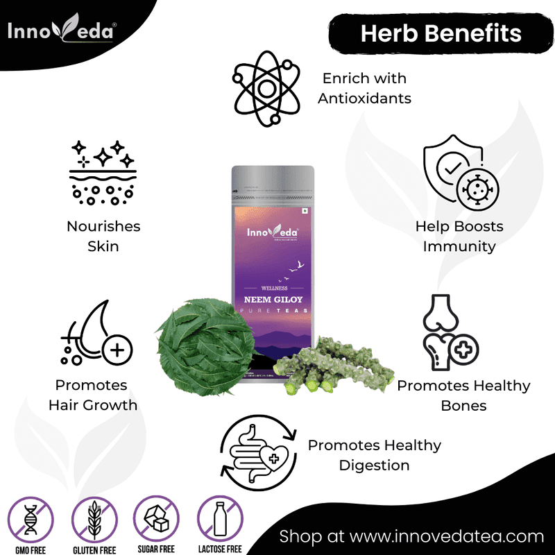 Neem Giloy Tea boosts immunity, clears skin, supports liver and respiratory health, and energizes with bitter, peppery, and citrusy herbal notes.