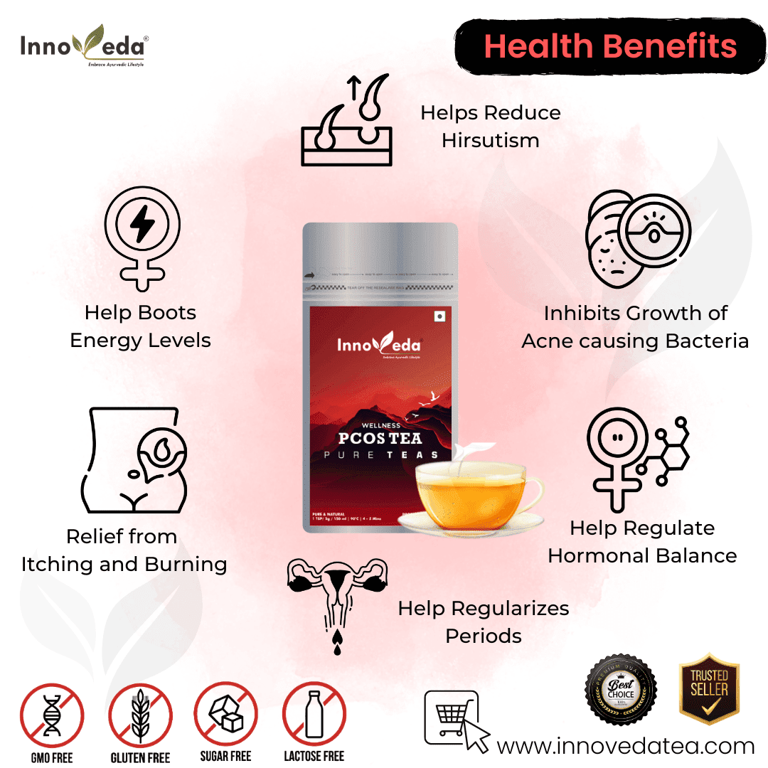 PCOS Relief Tea balances hormones, regularizes periods, boosts fertility, reduces acne, and improves mood with a refreshing herbal blend.