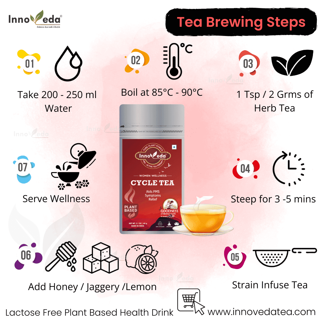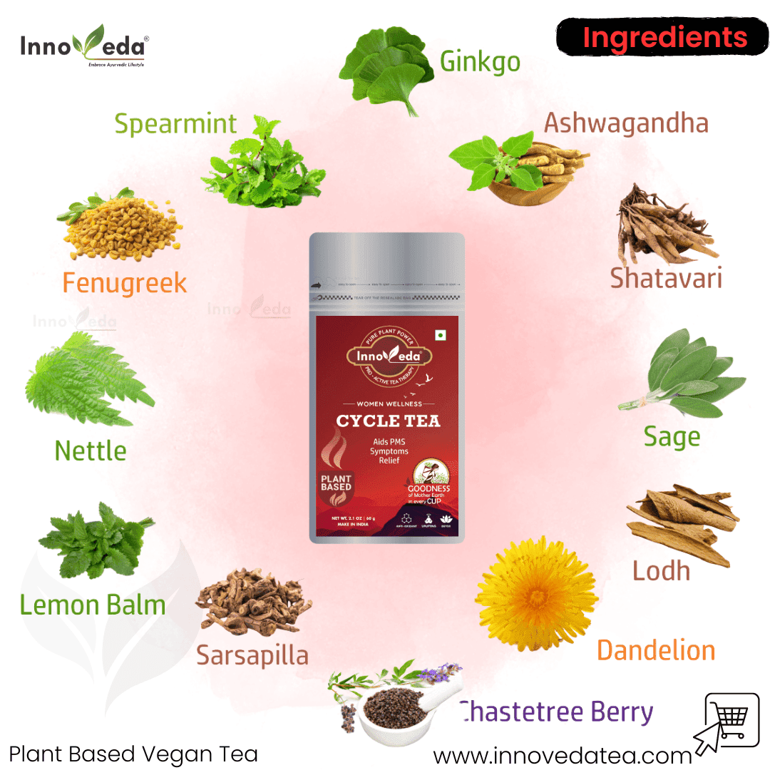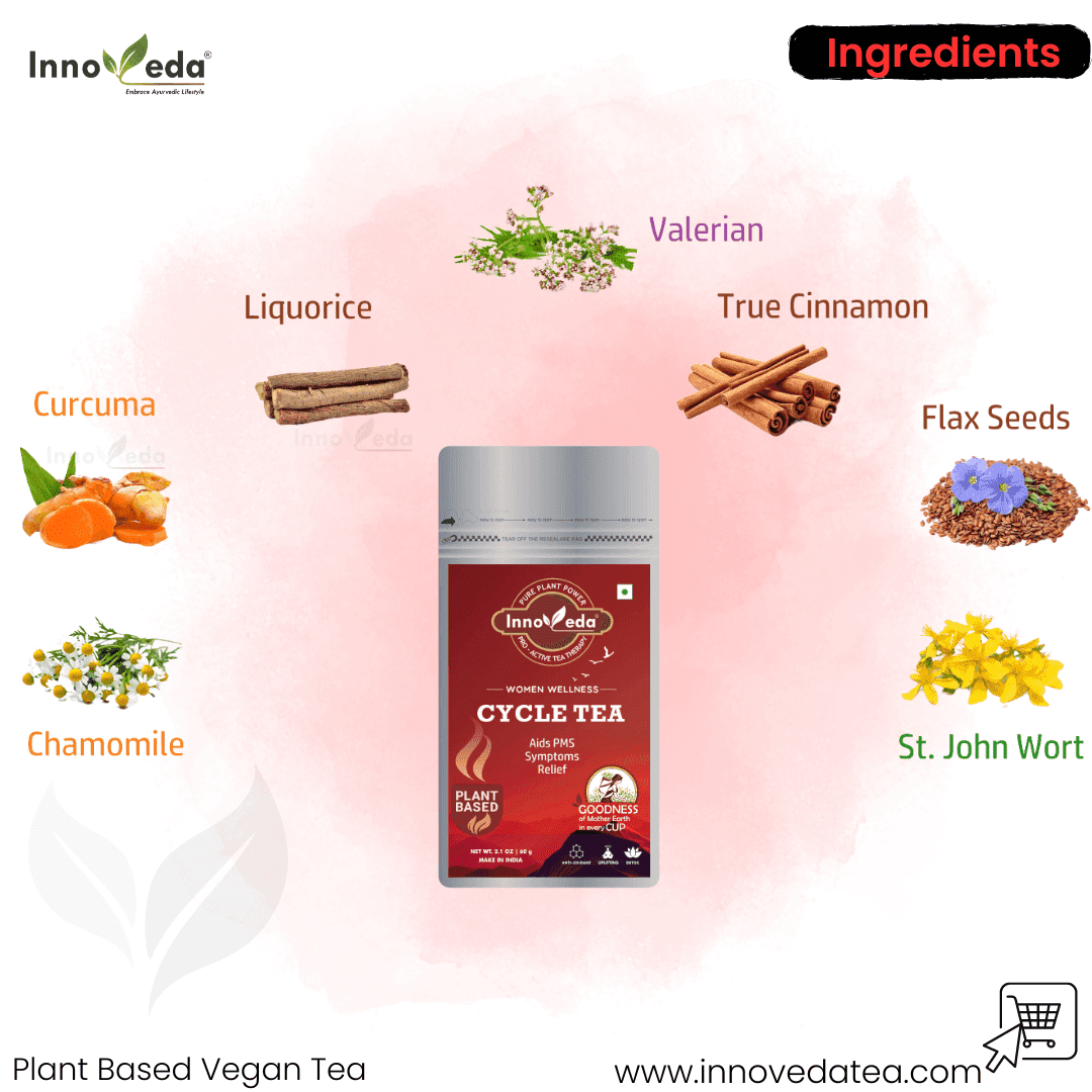 Cycle Tea by Innoveda is a natural, expertly-formulated herbal blend designed to relieve symptoms of PMS, perimenopause, and menopause. It helps balance hormones, regulate periods, and alleviate discomfort from cramps, bloating, food cravings, irritability, fatigue, hot flashes, and mood swings.