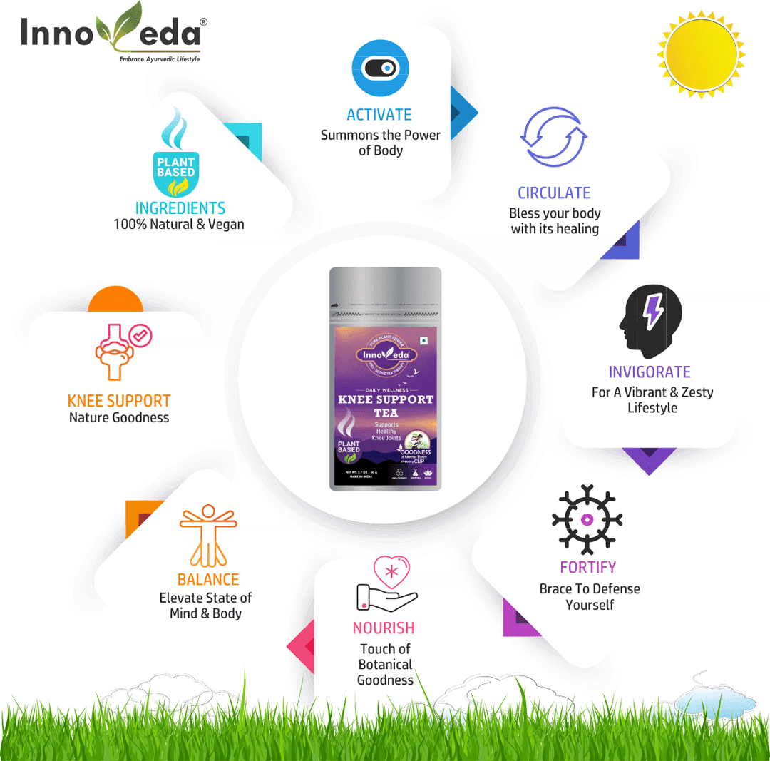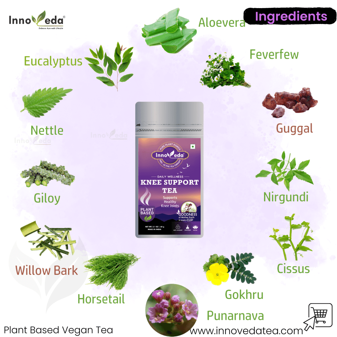 | Ingredients (Tea) | Aloe-Vera, Ashwagandha, Cissus, Eucalyptus, Fennel Seeds, Feverfew, Giloy, Ginger, Gokhru, Guggal, Harshringar, Horsetail, Lemon Grass, Liquorice, Moringa, Nettle, Nirgundi, Punarnava, Rosehip, St. John's Wort, Turmeric, Valerian, Willow Bark |