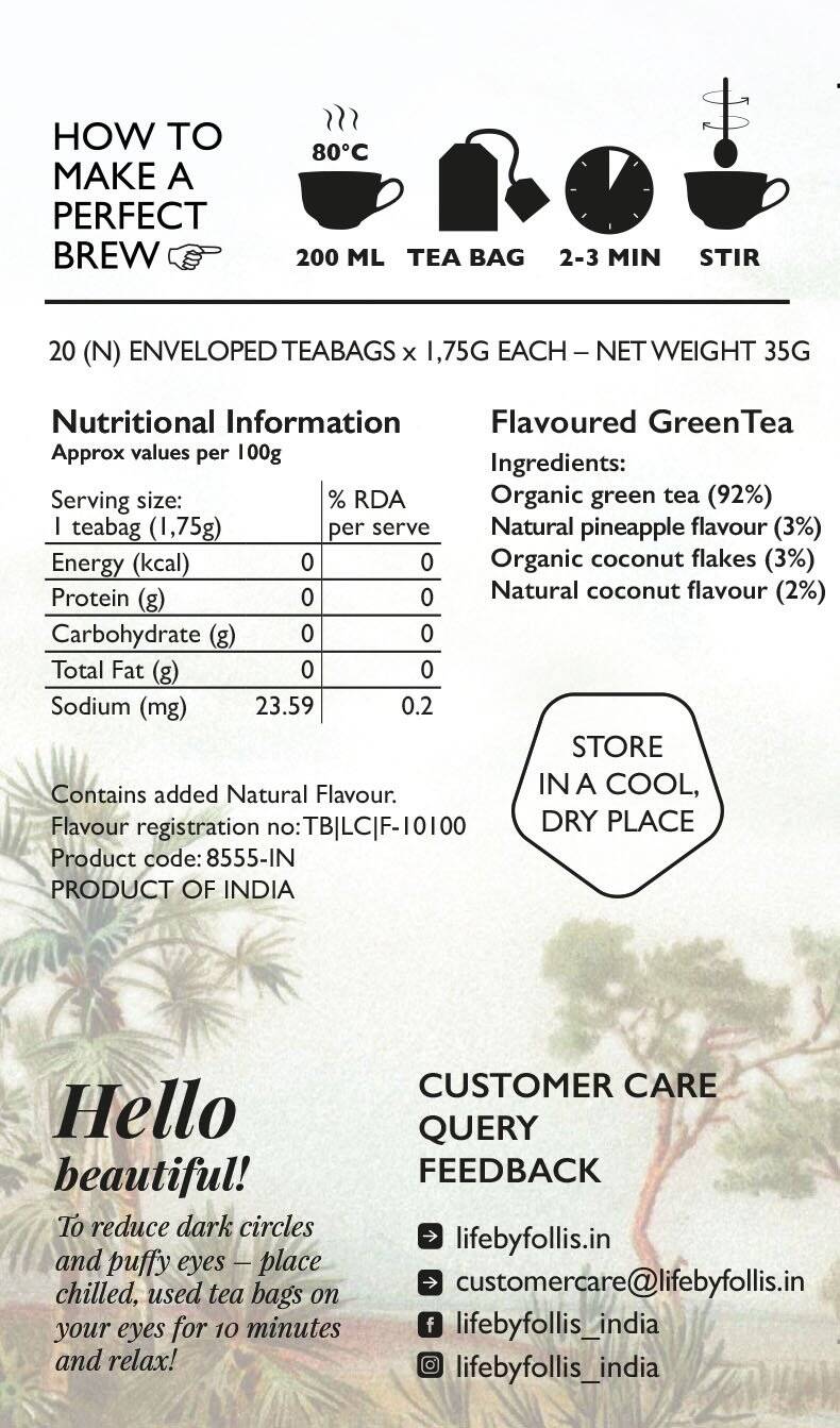 Tropical pineapple and coconut meet refreshing green tea—sunny, antioxidant-rich, and perfect for iced tea or a barefoot mental getaway.