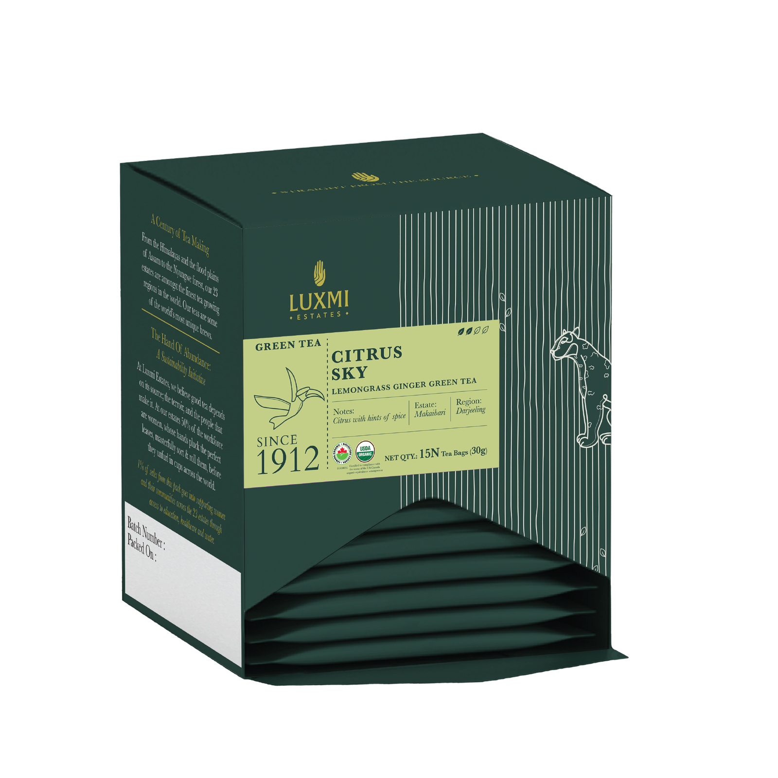 A vibrant blend of green tea, lemongrass, and wild ginger—zesty, warming, and organic. A sip of Himalayan harmony.