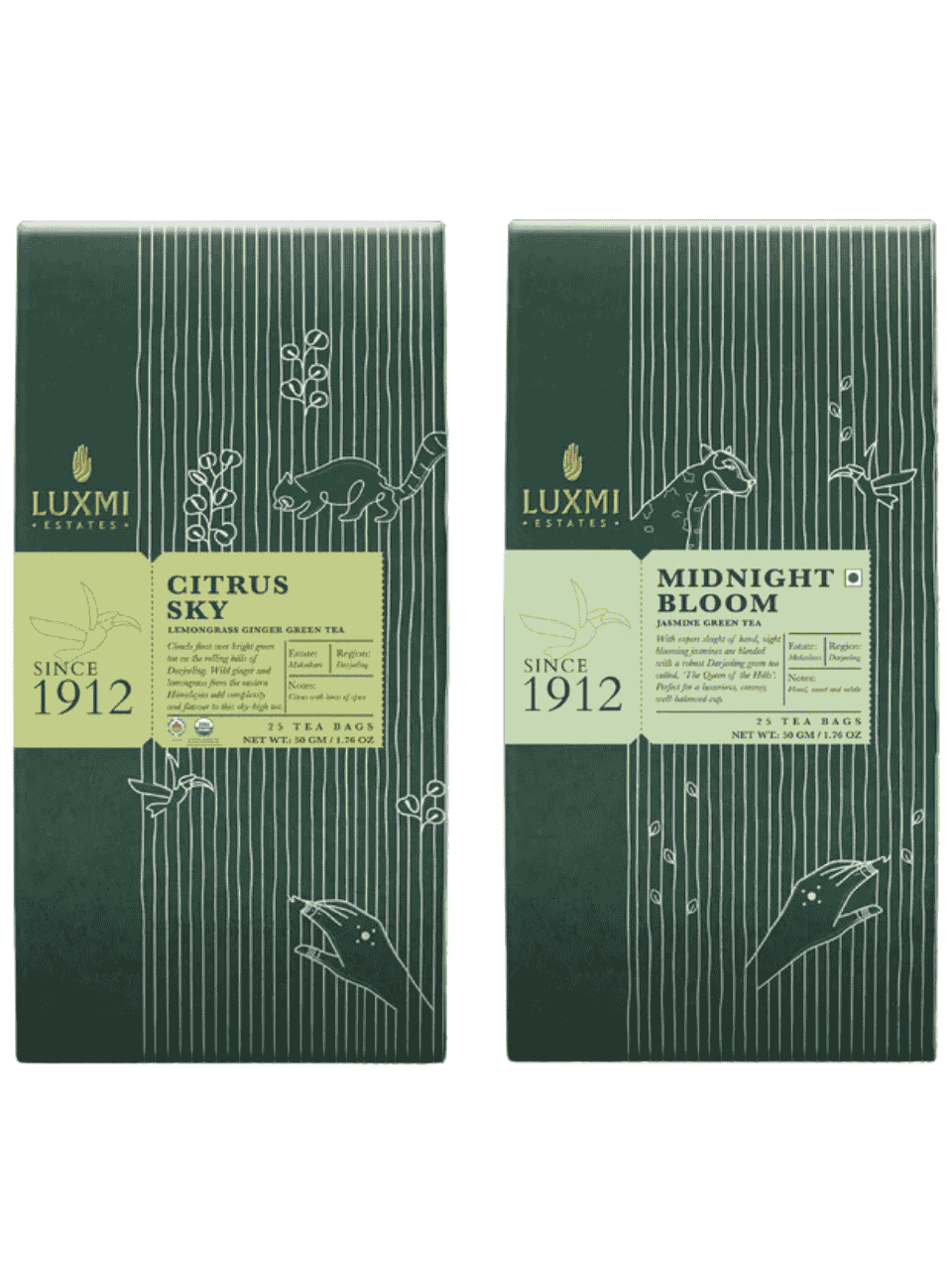 A vibrant detox duo featuring Jasmine Green Tea and Lemongrass Ginger Green Tea. Jasmine Green Tea brings subtle apple blossom aromas and creamy Darjeeling notes, while Lemongrass Ginger Green Tea layers citrus brightness with a hint of spice from wild ginger. Crafted from the fertile hills of Darjeeling, this green tea bundle is a cleansing, aromatic wellness ritual in every sip.