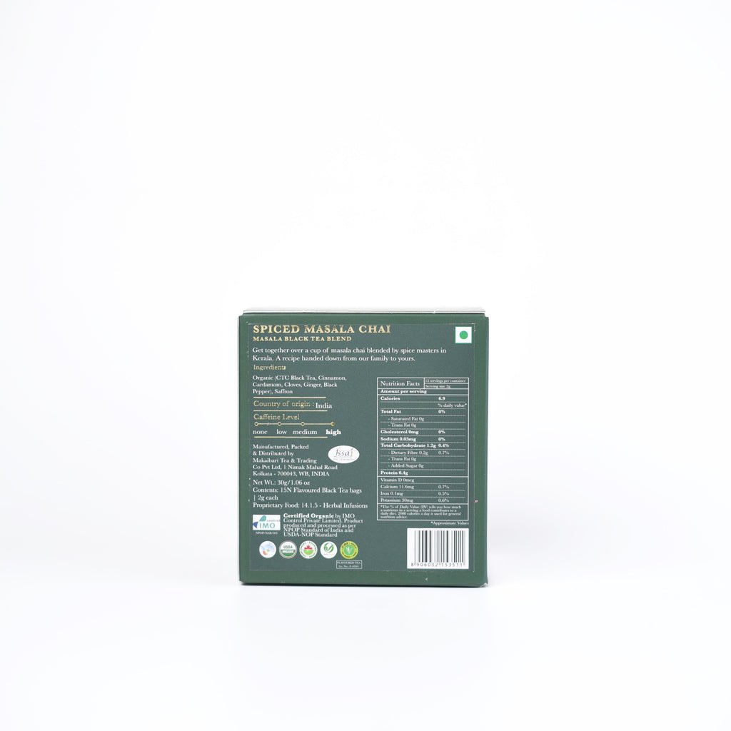 | Ingredients (Tea) | Black Pepper, Black Tea, Cardamom, Cinnamon, Cloves, Ginger, Saffron |