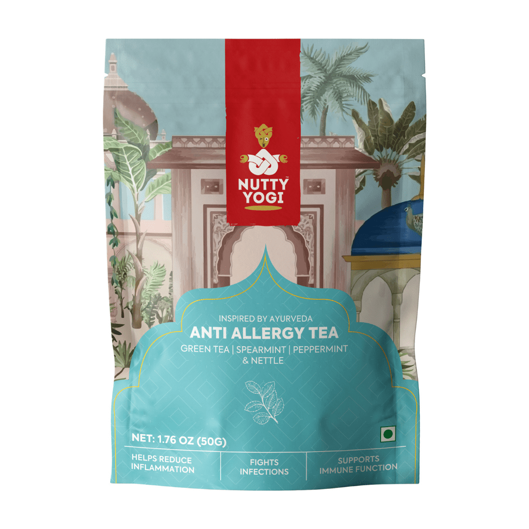 Nutty Yogi Anti Allergy Tea is a refreshing herbal green tea blend of spearmint, peppermint, and nettle leaves. Made with 100% natural whole leaves, it offers a cooling aroma, soothing taste, and quick relief from allergy symptoms—pure, effective wellness with Nutty Yogi goodness in every sip.