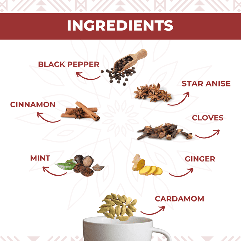 | Ingredients (Tea) | Black Pepper, Cardamom, Cinnamon, Cloves, Ginger, Mint, Star Anise |
