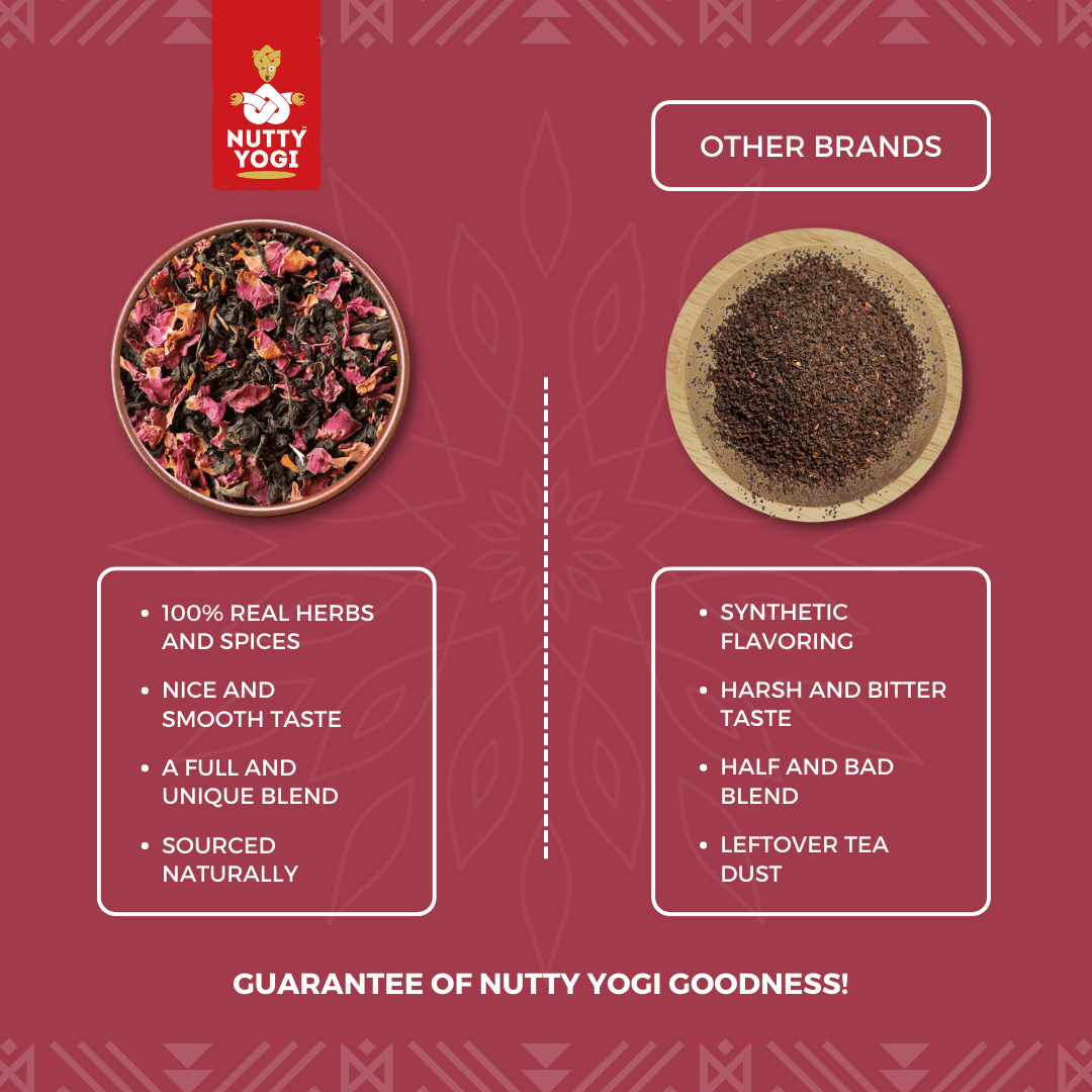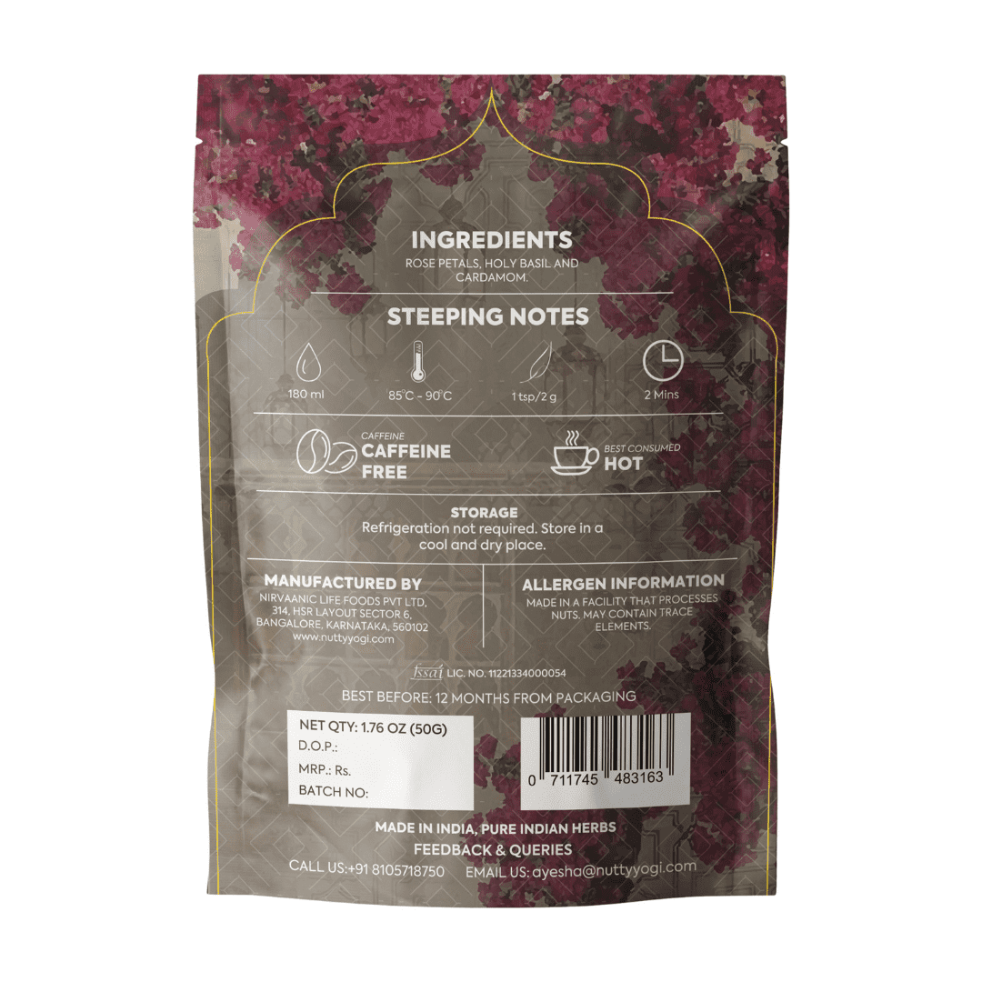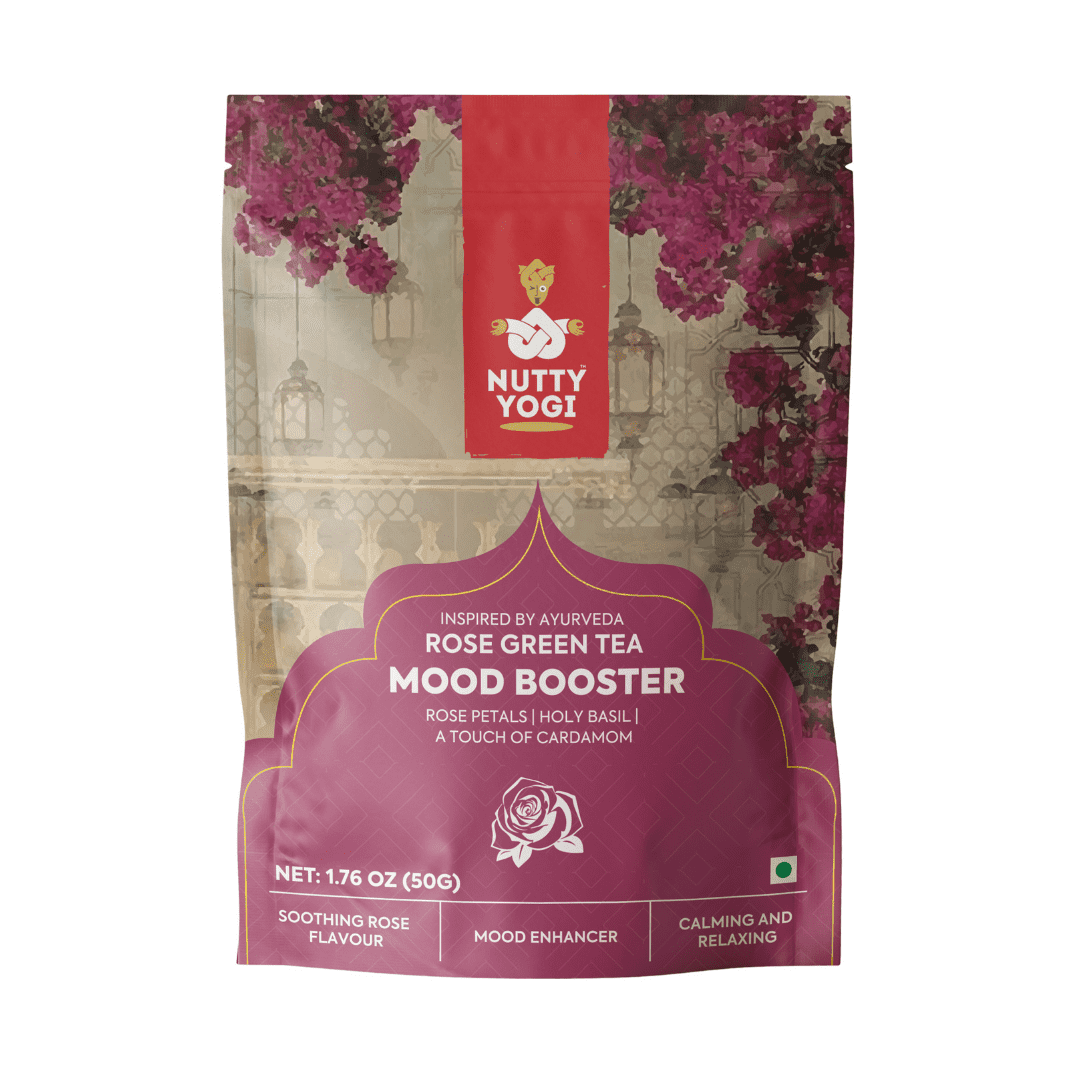 Nutty Yogi Rose Tulsi Tea is a perfect mood booster, blending rose petals, holy basil, and cardamom with fresh green tea. Calming and immune-boosting, it brews into a fragrant, refreshing cup with guaranteed Nutty Yogi goodness in every sip.
