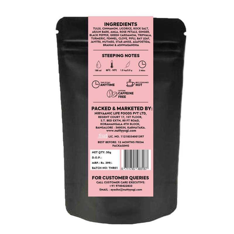 | Ingredients (Tea) | Amla, Ashwagandha, Bay-Leaves, Black Pepper, Brahmi, Cardamom, Cloves, Ginger, Holy Basil (Tulsi), Licorice Root, Nutmeg, Rose Petals, Star Anise |