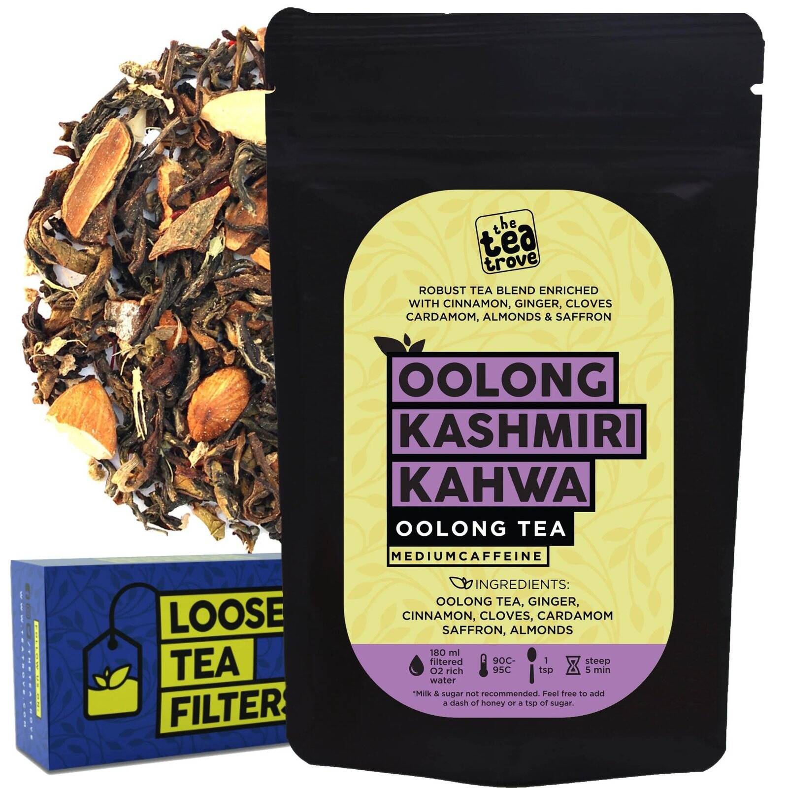 Unveil the royal essence of Kashmir in every cup with our Maharaja Kashmiri Shahi Kahwa, an opulent blend of Darjeeling oolong tea and rich Indian spices. This traditional brew combines the smooth, floral complexity of oolong tea with the warming notes of cinnamon, cloves, ginger, cardamom, saffron, and crushed almonds to create an indulgent and aromatic infusion that speaks of heritage and health.