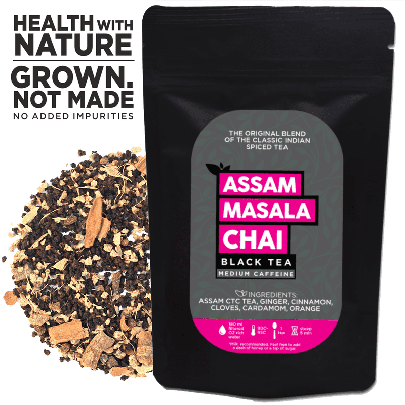 Spicy Assam masala chai with cinnamon, cardamom, and cloves. Aids weight loss, blood pressure, digestion, and anti-ageing.