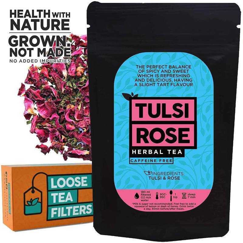 Tulsi and rose herbal tea. Caffeine-free, boosts immunity, relieves stress, cold, and stomach discomfort. Ideal for daily relaxation.